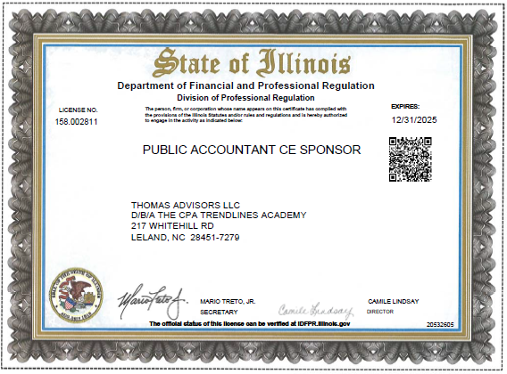 Thomas Advisors d/b/a The CPA Trendlines Academy is an approved IRS CE provider. Provider # IVYPC